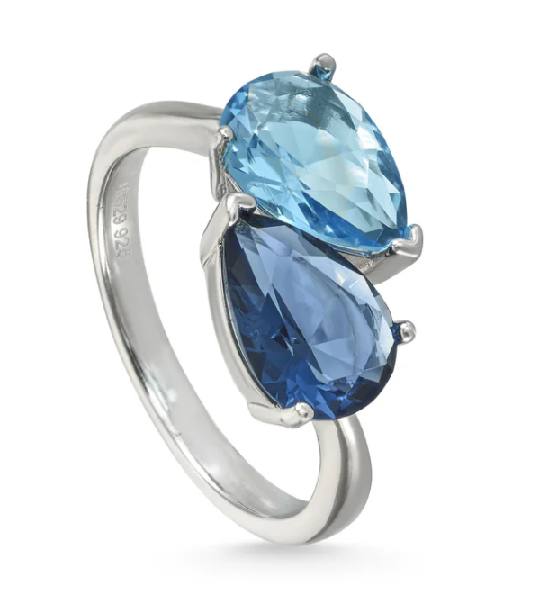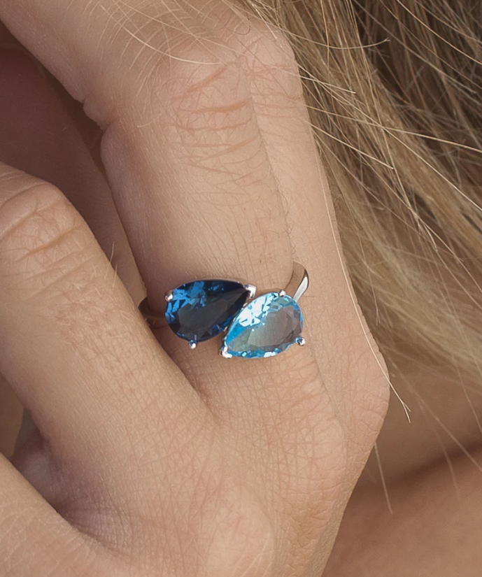 Ring med färgade stenar, denna eleganta kombination kommer att få dig att glänsa så fort du bär dem. Design av två päronslipade stenar i Azurite och Kalcedon.
