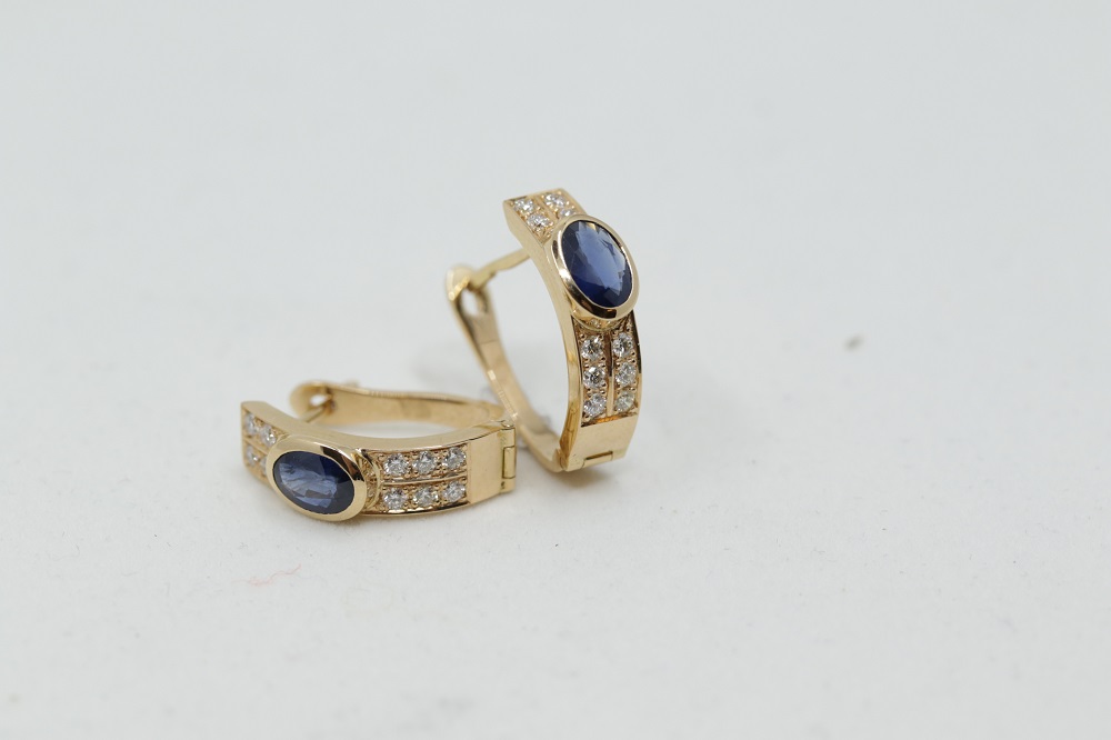Örhängena är smyckade med vars en oval safir och tio gnistrande diamanter.