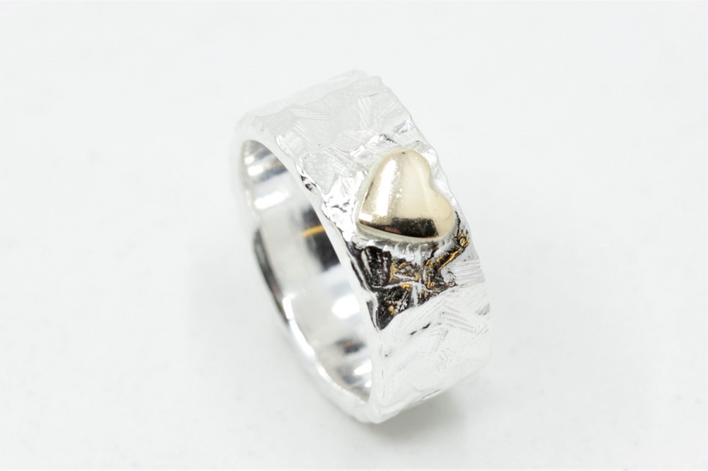 Vår klassiska Rocker-ring med den stenliknande ytan, här med ett hjärta av 18K guld.