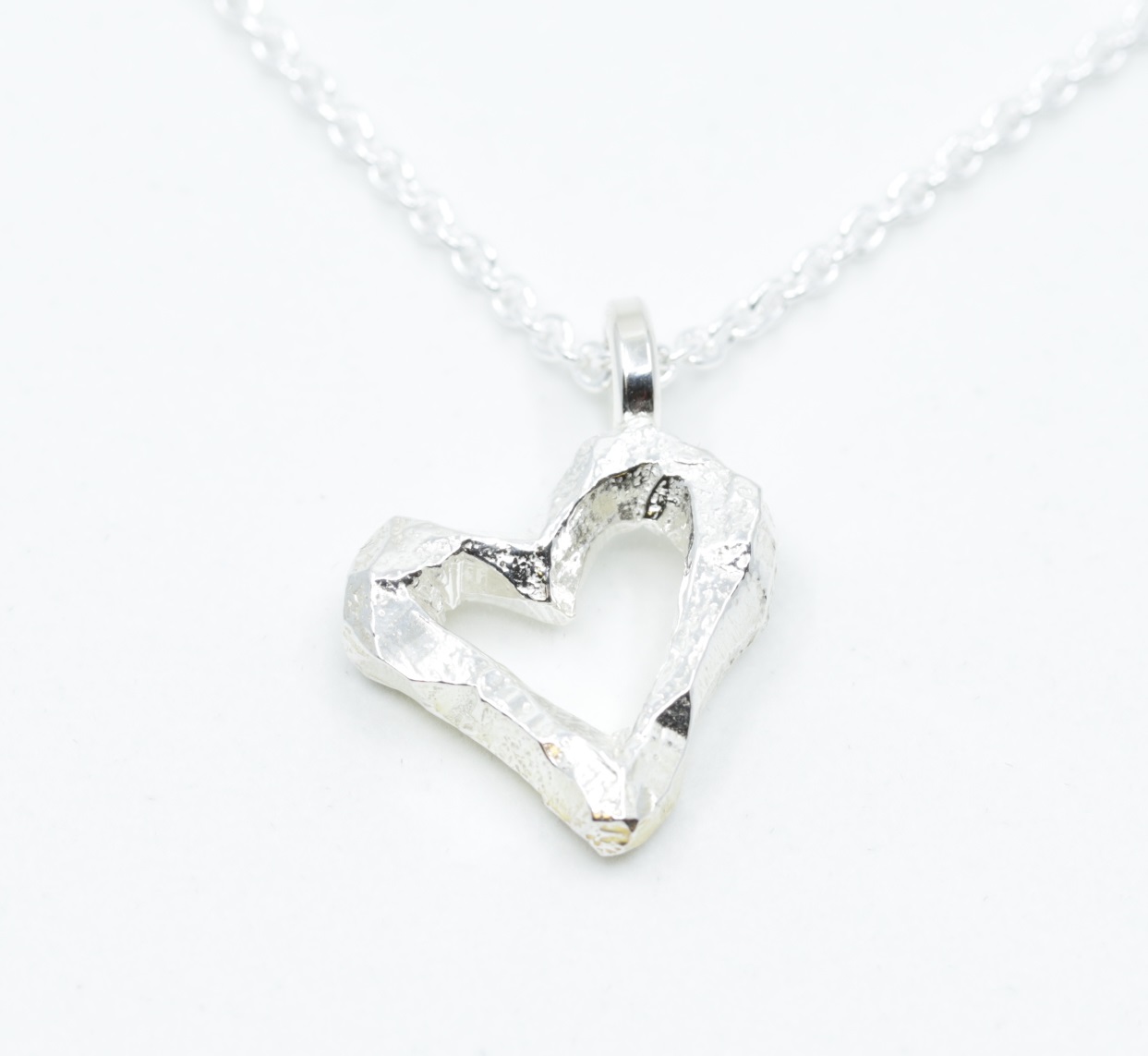 Hängets hjärtform har fått det unika rocker-utseendet, ett grovt sten-liknande hantverk med en ljust blank yta.